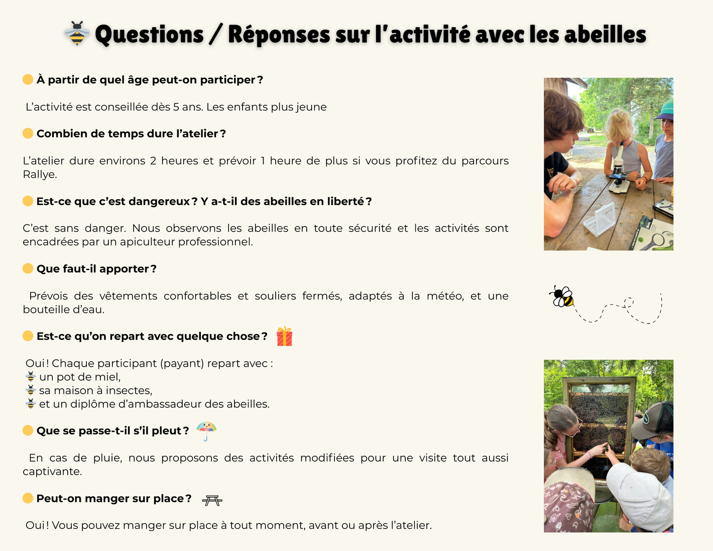 Que tu aies envie dâune courte dĂ©couverte, dâune immersion complĂšte guidĂ©e ou dâune exploration ludique Ă ton rythme, nos visites Ă la ferme te plongent au cĆur du monde fascinant des abeilles.